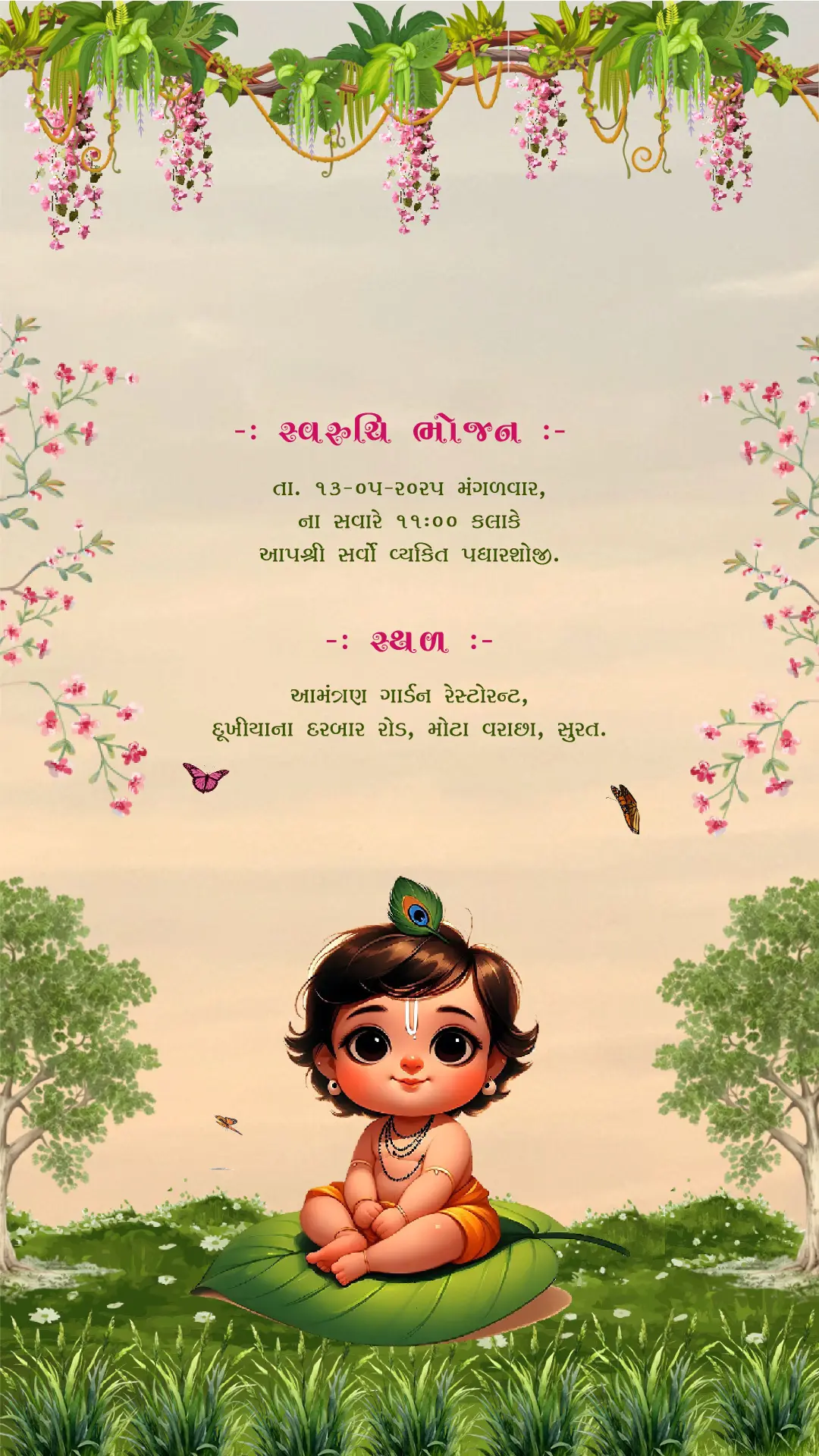 This beautifully designed card features adorable Bal Krishna resting peacefully on a decorated swing surrounded by soft pink floral garlands and fresh greenery. The calming pastel background creates a graceful atmosphere, while the floral borders symbolize growth, prosperity, and new beginnings.