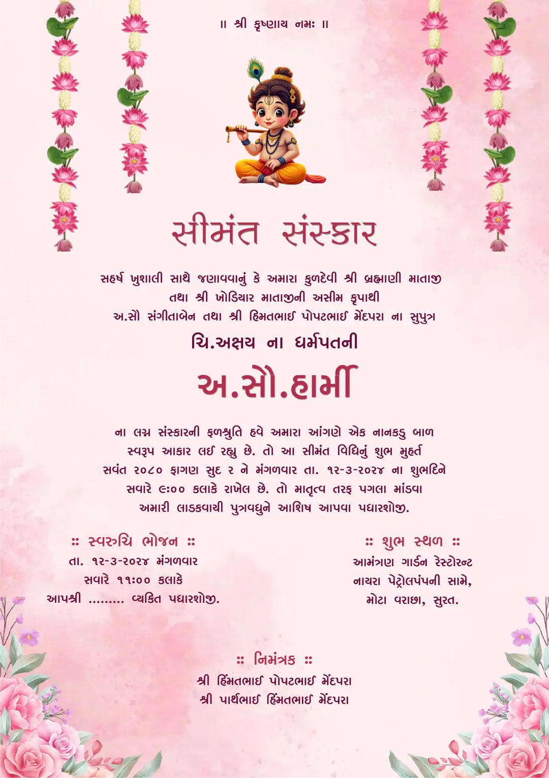 Pink Krishna Seemant Invitation | Floral Baby Shower Card Gujarati