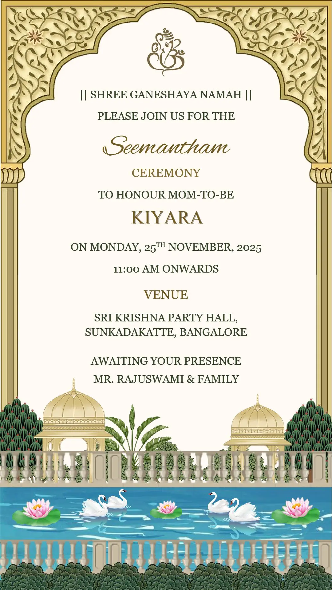 This golden arch baby shower card is ideal for Seemantham, Srimantham, Godh Bharai, and other Indian maternity blessing ceremonies. It suits families who prefer a royal and temple-inspired theme for their celebration.