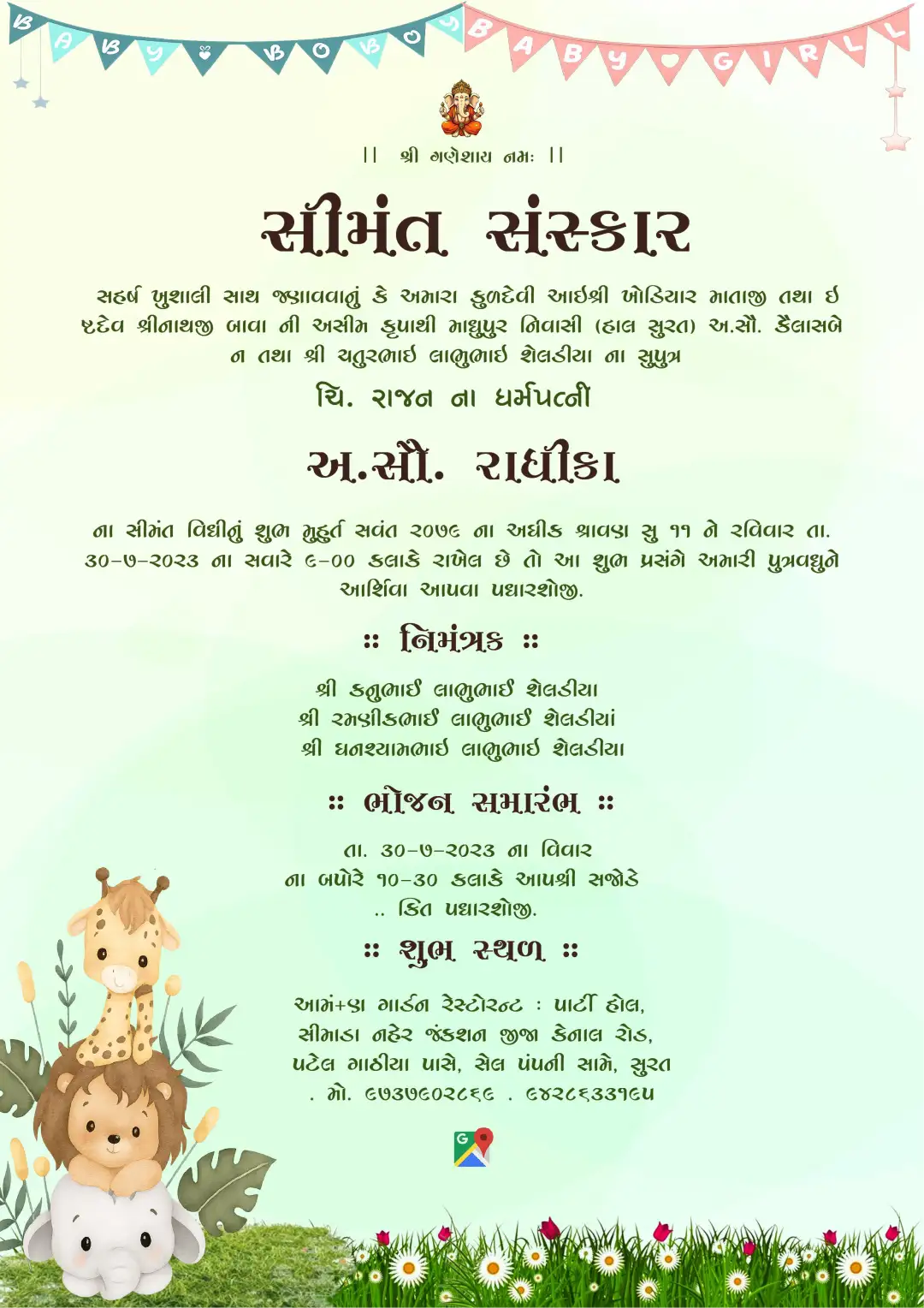 Cute baby garland themed Seemant Sanskar invitation card with jungle animals and Gujarati traditional text. Ideal for digital baby shower invitations.