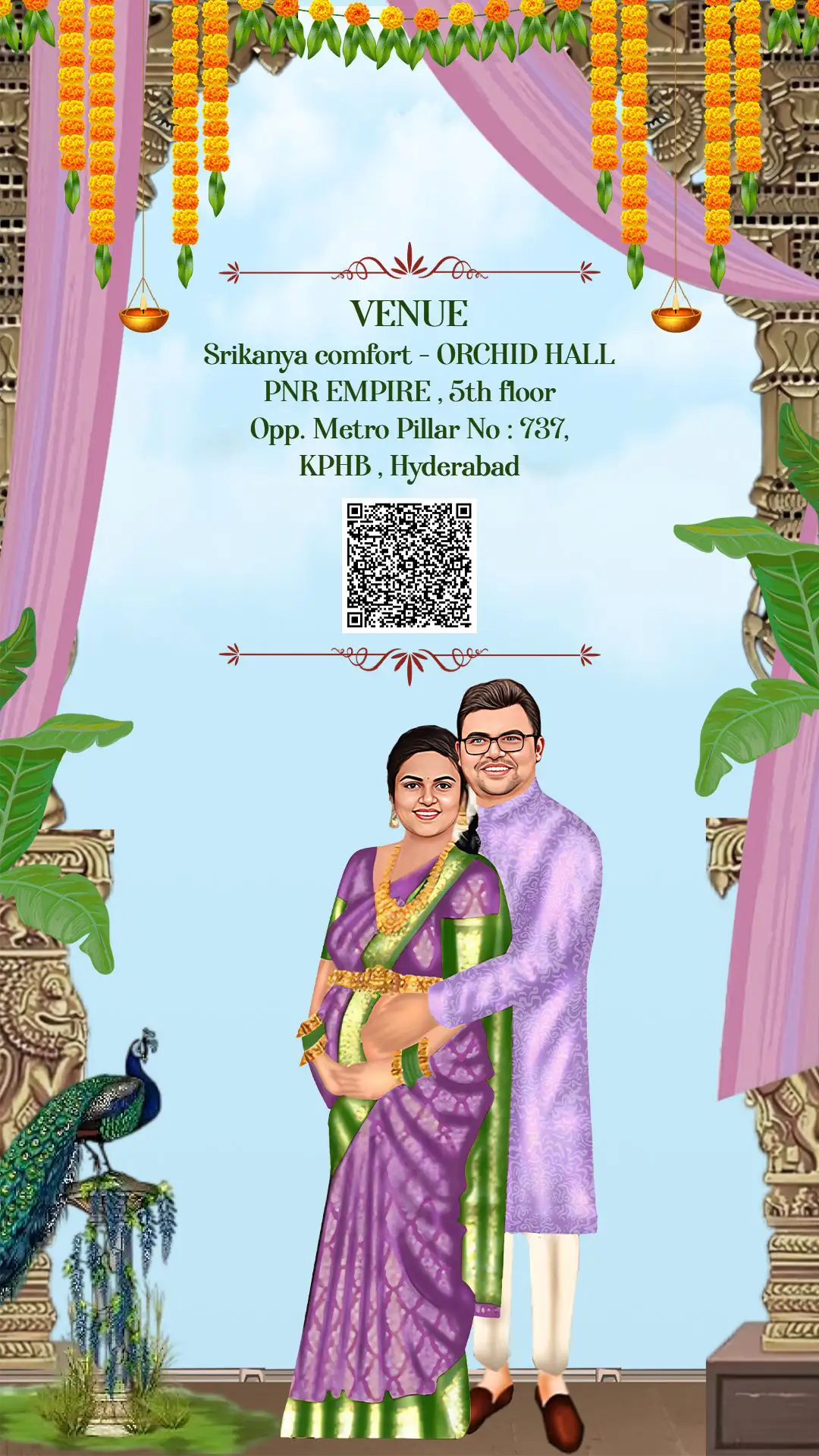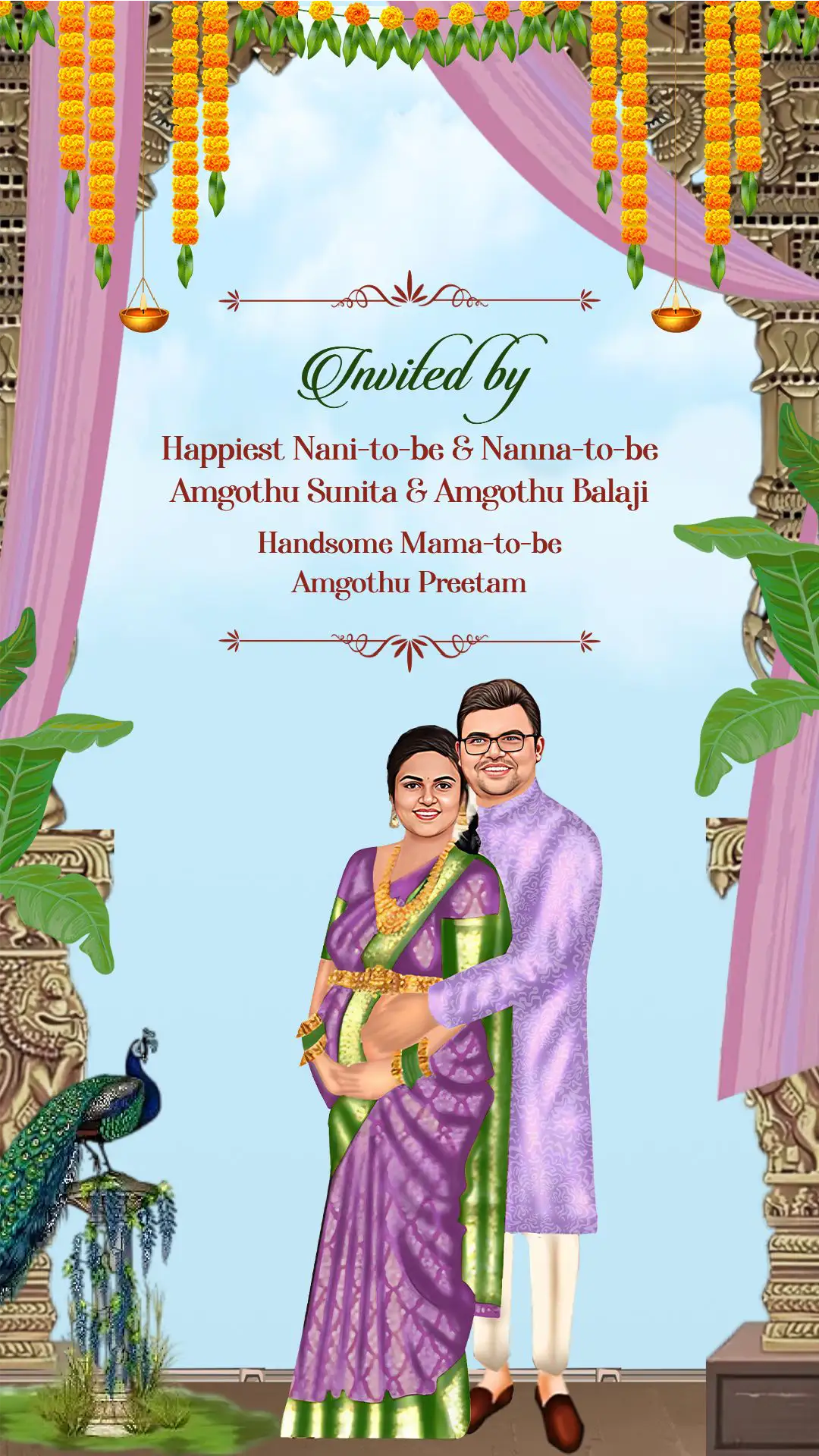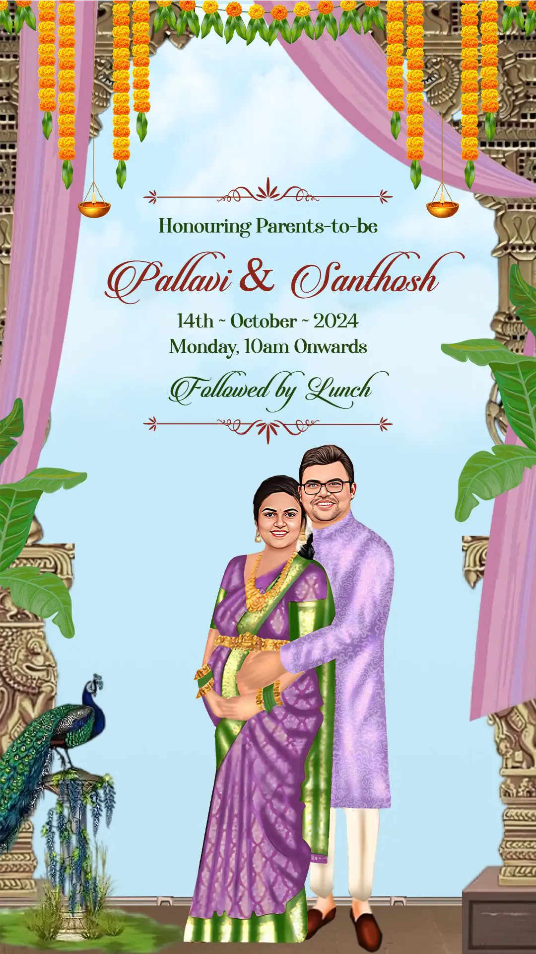 This beautifully designed traditional seemantham invitation reflects the cultural elegance of a South Indian baby shower ceremony. The temple-inspired backdrop, marigold garlands, hanging diyas, and decorative pillars create an authentic and festive atmosphere. The design captures the sacred essence of the Seemantham ritual while maintaining a graceful and artistic presentation.